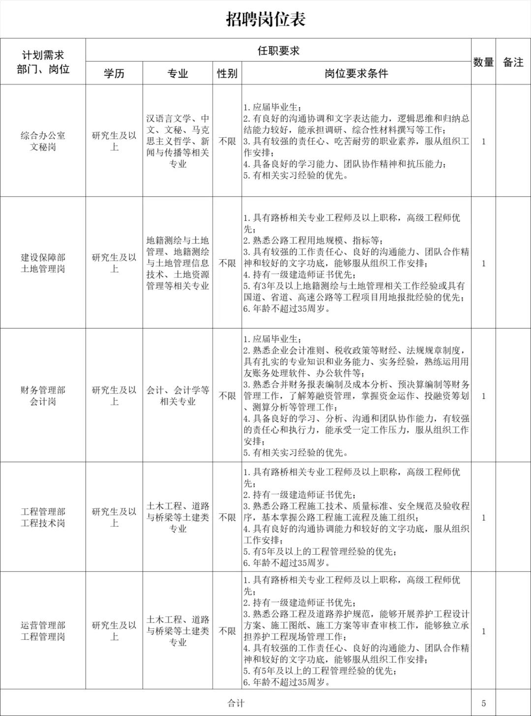 福州交建集团需招聘人员5名,具体岗位招聘条件及人数详见附件。