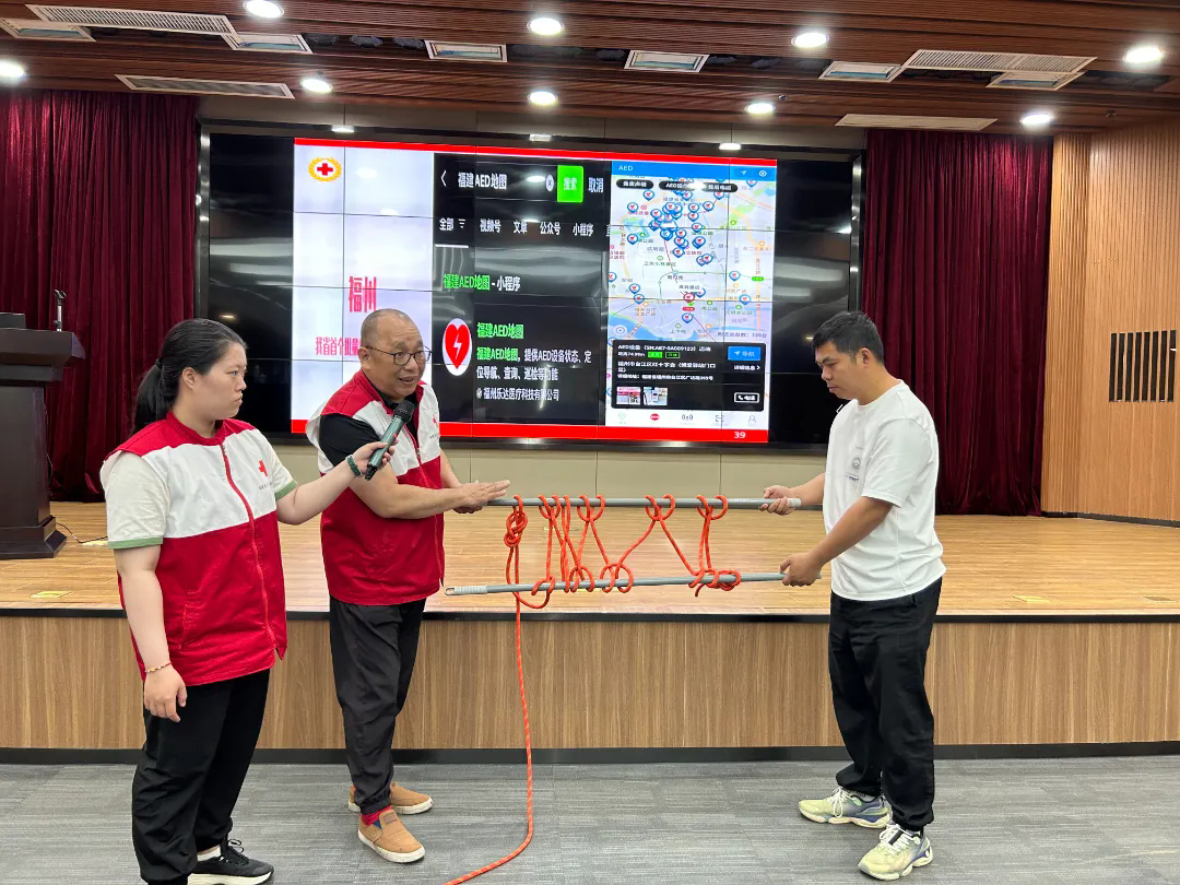 在理论教学中,老师详解心肺复苏的操作方法及注意事项、AED操作流程、外伤止血包扎和固定技巧以及气道异物梗阻的识别与处置要点。在简易担架制作环节,老师就地取材利用拖把杆、绳索等物品,快速制作出可承重的临时担架。“没想到两根拖把杆就能救命,这对灾害现场的伤员转运太实用了!”参训学员在实操后感慨道。