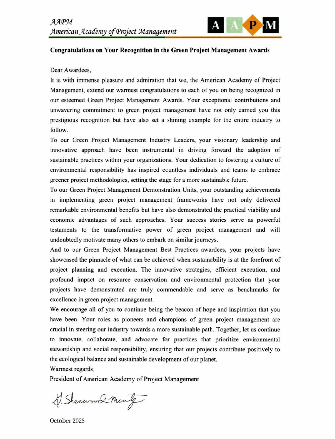 美国项目管理学会(AAPM)成立于1951年,是全球绿色项目管理发起组织、绿色项目管理国际倡导组织。本次评选邀请了国内工程建设与可持续发展领域的顶尖专家组成评审委员会,旨在通过权威、公正的评选机制,挖掘并展示绿色项目管理标杆。其中,中国区“绿色项目管理卓越实践”奖项设40席,以表彰具有创新性、实用性和可推广性的绿色项目管理实践案例。
