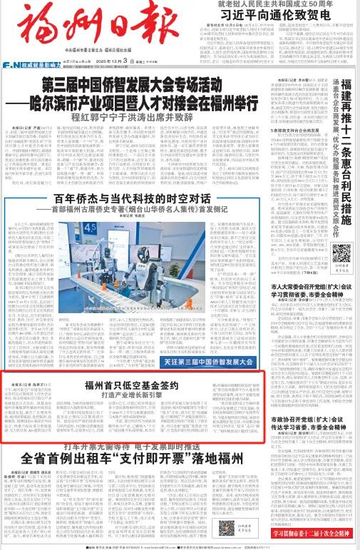 福州日报头版关注福州首只低空基金签约,该基金由福州冶城集团所属福州规划设计集团发起,联合广东粤科金融、福州国资集团、金控集团、鼓楼城投、鼓楼国投6家国企共同设立,为福州发展低空经济新赛道注入强劲资本动能。