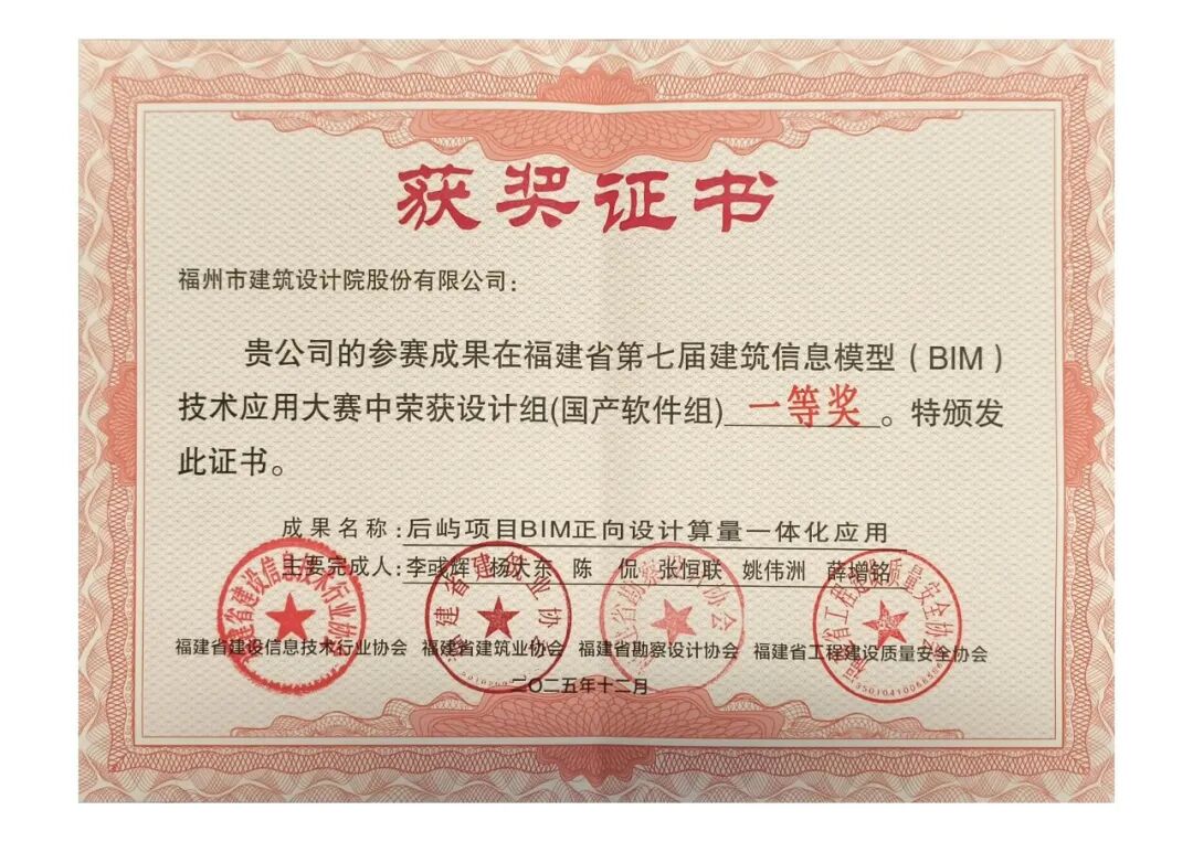 近日,“福建省第七届建筑信息模型(BIM)技术应用大赛”获奖名单正式公布。福州城投集团所属市建筑设计院申报的“后屿地块建设项目正向设计与算量一体化应用实践”项目,在设计组(国产软件组)出色表现,荣获大赛一等奖。