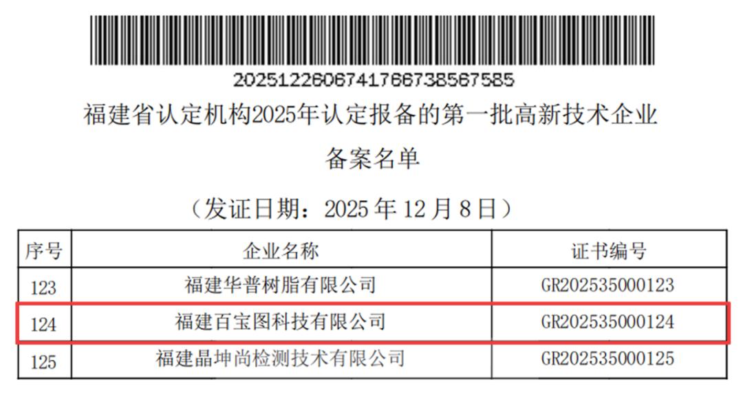 12月26日,根据《高新技术企业认定管理办法》(国科发火〔2016〕32号)和《高新技术企业认定管理工作指引》(国科发火〔2016〕195号)有关规定,福州冶城集团所属福州市勘测院有限公司权属企业福建百宝图科技有限公司(以下简称“百宝图公司”)成功通过国家高新技术企业认定,被列入福建省认定机构2025年认定报备的第一批高新技术企业备案名单,这标志着百宝图公司在科技创新能力、核心自主知识产权、科技成果转化及企业成长性等方面获得了国家级权威认可,是其发展历程中的重要里程碑。