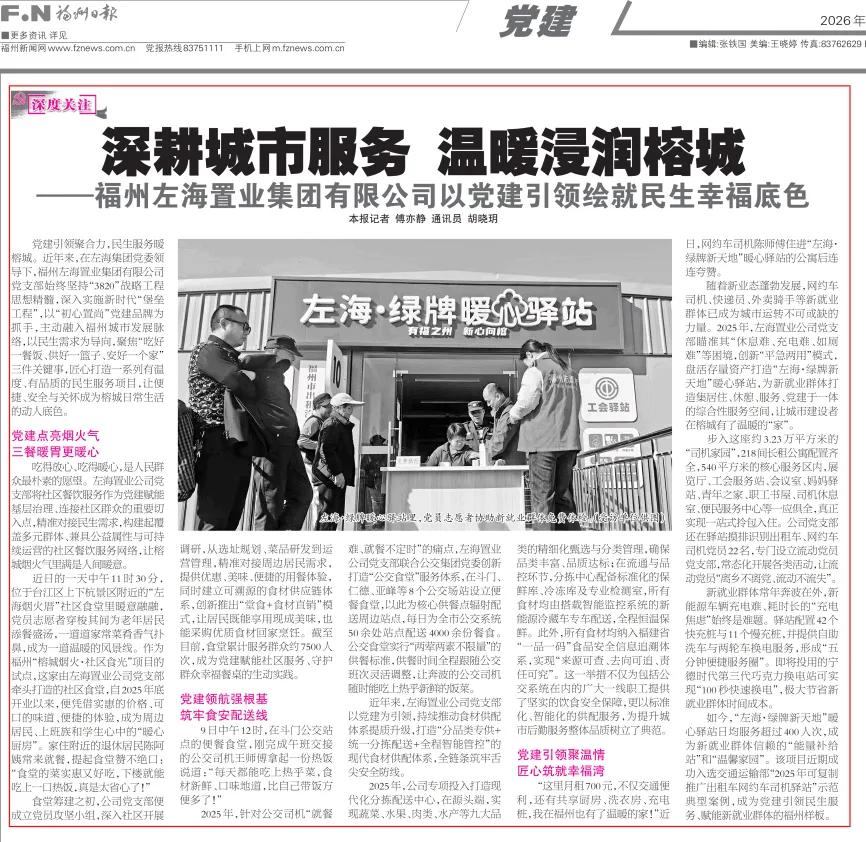 党建引领聚合力,民生服务暖榕城。近年来,在市国资委、左海集团党委领导下,福州左海置业集团有限公司党支部始终坚持“3820”战略工程思想精髓,深入实施新时代“堡垒工程”;以“党旗扬·国企强”全市国企党建公共品牌为引领,以“初心置尚”党建品牌为抓手,打造“红链筑+”产业链党建品牌,主动融入福州城市发展脉络;以民生需求为导向,聚焦“吃好一餐饭、供好一篮子、安好一个家”三件关键事,匠心打造一系列有温度、有品质的民生服务项目,让便捷、安全与关怀成为榕城日常生活的动人底色。