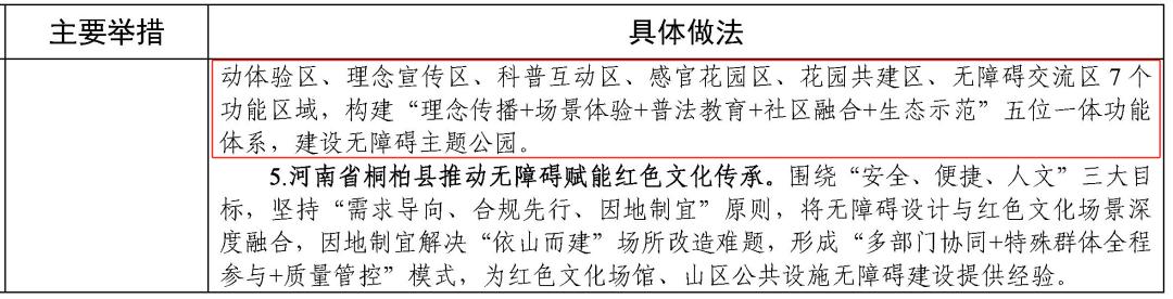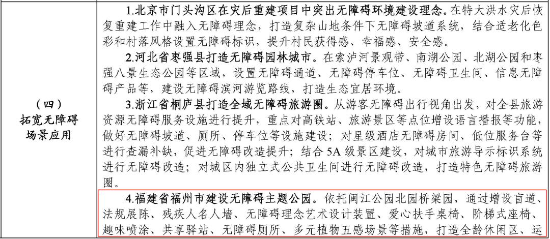 福州市无障碍主题公园依托闽江公园北园桥梁园,通过增设盲道、法规展陈、残疾人名人墙、无障碍理念艺术设计装置、爱心扶手桌椅、阶梯式座椅、共享驿站、无障碍厕所灯措施,打造全龄休闲区、运动体验区、理念宣传区、科普互动区、感官花园区、花园共建区、无障碍交流区7个功能区域,构建“理念传播+场景体验+普法教育+社区融合+生态示范”五位一体功能体系,建设无障碍主题公园。
