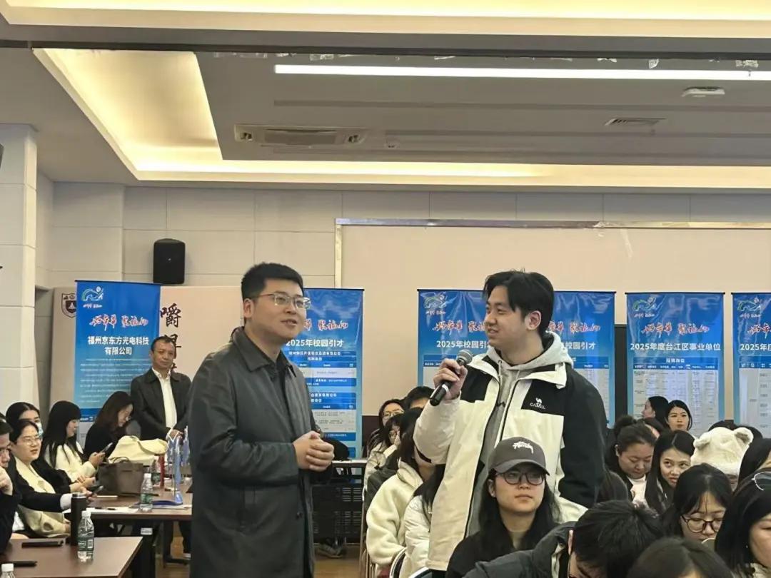 活动现场,各用人单位竞相开展推介:市国资委、台江区委组织部有关同志分别对福州市经济发展、人文历史、宜居宜业的环境氛围做了宣传;市人事人才服务中心负责人专题解读福州“青榕工程”最新人才政策,从免费安居到交通补贴,从落地安家费到购房扶持,从实习研学保障到专属人才服务,让政策“大礼包”的诚意直抵人心,引发学子们的热烈咨询与浓厚兴趣。在山东大学专场活动中,引才团队特别邀请该校2024届毕业生、现任福州振兴乡村集团企业发展部副经理南旺,以校友视角分享择业心路与在榕成长故事,为学弟学妹们送上接地气的求职“锦囊”。这种“身边人讲身边事”的鲜活形式,让引才诚意更具感染力与说服力。