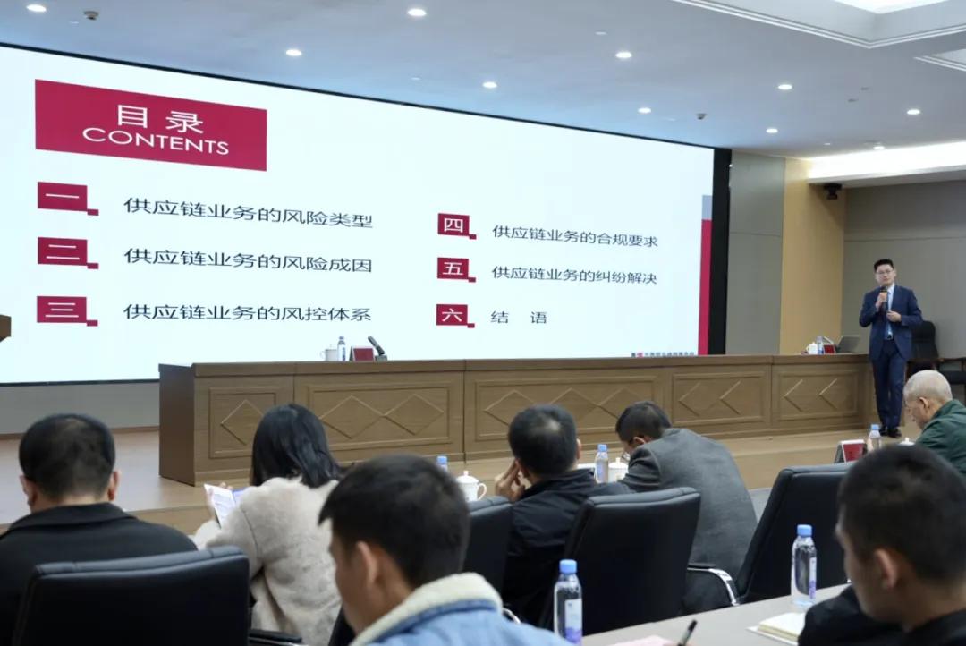 培训邀请风控领域专家吴业泉律师授课。吴律师以“供应链业务风险管控实务”为主题,系统讲解了大宗商品供应链运营的核心风险识别方法、关键管控节点及实操应对策略,内容兼具专业性与实用性,为各企业破解风控难题、提升管理水平提供了专业指导。