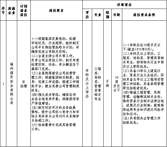 福州园开实业有限公司为福州工业园区开发集团有限公司权属企业,主要聚焦企业产业链上下游资源,深耕建材服务产业链领域,积极拓展供应链服务等战略性新兴业务。为充实完善公司干部队伍配备,拓宽选人用人视野,引进优秀企业经营管理人才,拟市场化选聘职业经理人1名,现制定具体方案如下: