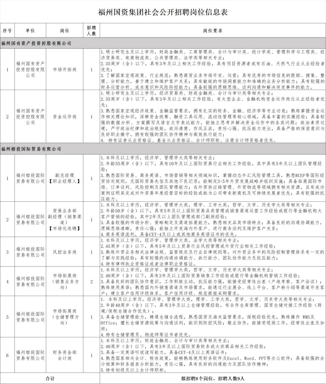 现因业务发展需要,福州国资集团拟面向社会公开招聘9人,现将有关招聘事项公告如下: